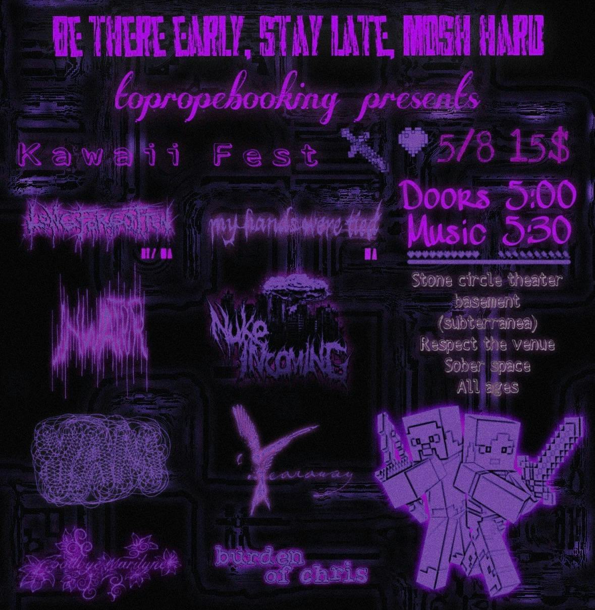 This is a hardcore show for our friend Kawaii’s birthday! The bands playing are Yam, Goodbye Marilyne, Inwater, My Hands Were Tied, Long Forgotten, Nuke, Incoming!, Burden of Chris, and Tearaway! Three of these bands are from Massachusetts: those bands are my hands were tied, long forgotten, and a secret set.