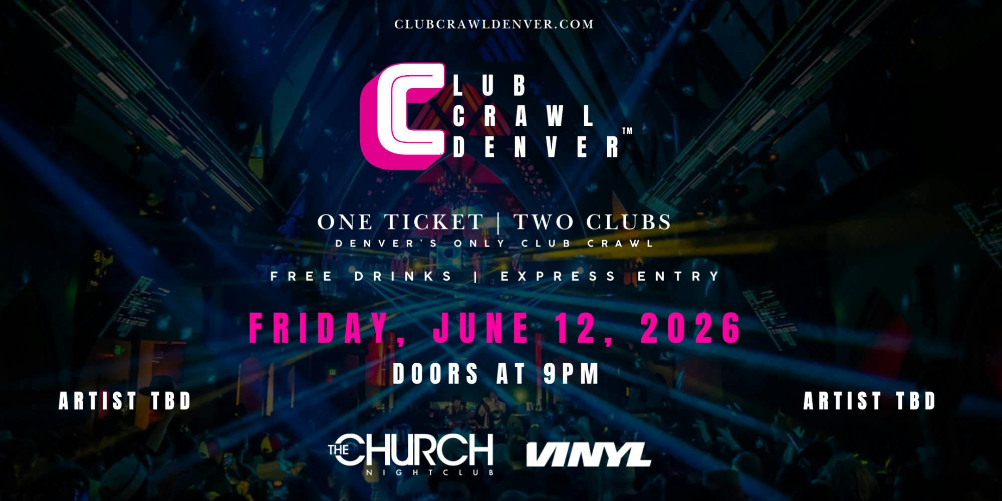 Club Crawl is Denver's #1 nightlife experience that brings you VIP express entry to both Church Nightclub and Club Vinyl and two complimentary drink tickets, all with one ticket.