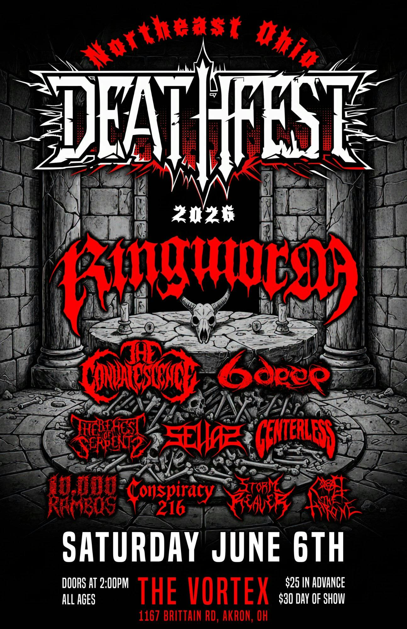 Northeast Ohio Deathfest 2026 June 7th Headlined by Ringworm , The Convalescense, 6deep, The Behest of Serpents, Selias, Centerless, Conspiracy 216, Storm Reaver, Covet the Throne