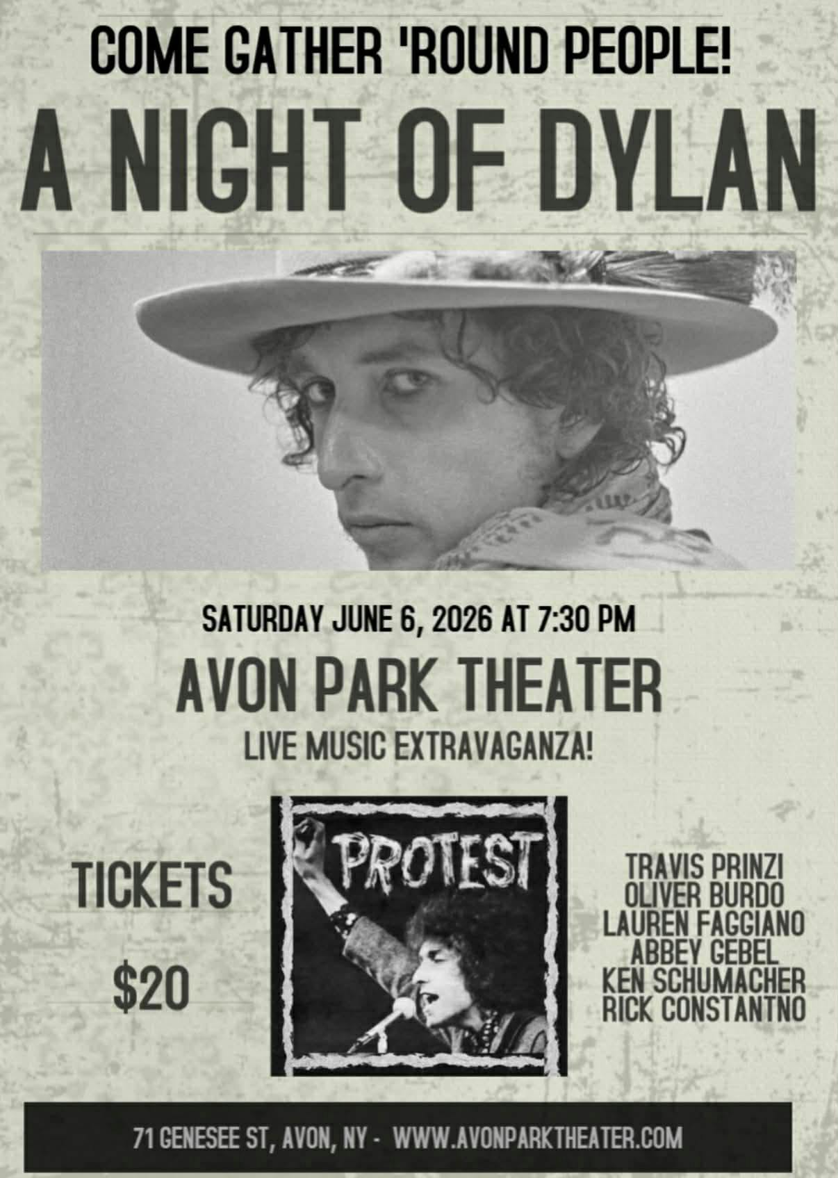 Travis Prinzi's Bob Dylan Extravaganza returns to the Avon Park Theater! With an emphasis on the 60's protest music and the mid-70's Rolling Thunder Revue tour, Travis, Oliver Burdo, Lauren Faggiano, Abbey Gebel, Ken Schumacher, and Rick Constantino will bring the music of Dylan to life on stage in Avon once again. Don't miss it!