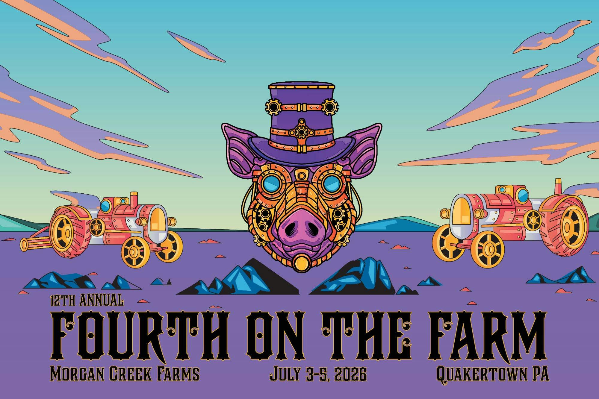 Gear up and mark your chronometers for the 12th Annual Fourth on the Farm–a two-day celebration, held at the beautiful Morgan Creek Farms in Quakertown, PA, where magical music, alluring art, and convivial community are the cogs in this well-oiled machine. The Steampunk Pigs are boarding the aeroship for your favorite weekend of the year, so don’t be a punk—join the funk!