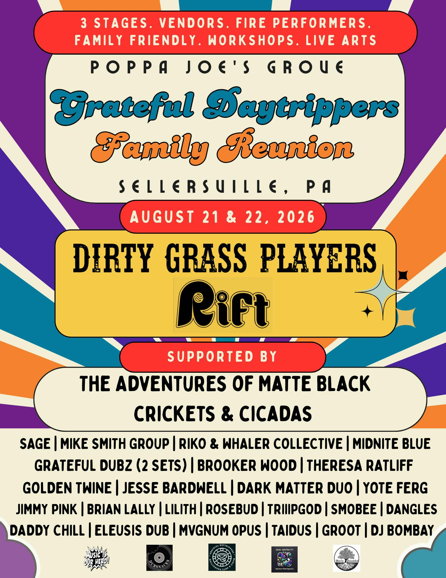 Grateful Daytrippers Family Reunion is a homegrown, grassroots music and arts festival held in Sellersville, PA at the beautiful Poppa Joe’s Grove.