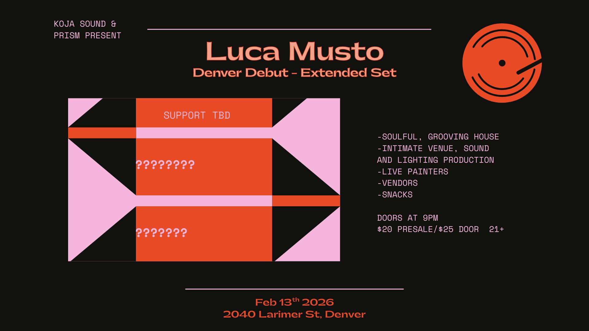 We will be prepping the gallery with intimate sound and lighting production to transform the space and set an ethereal and chill vibe. Satisfy your deepest cravings of groove and bass as you're taken on a transformative journey through time and space with a signature Luca Musto extended set.