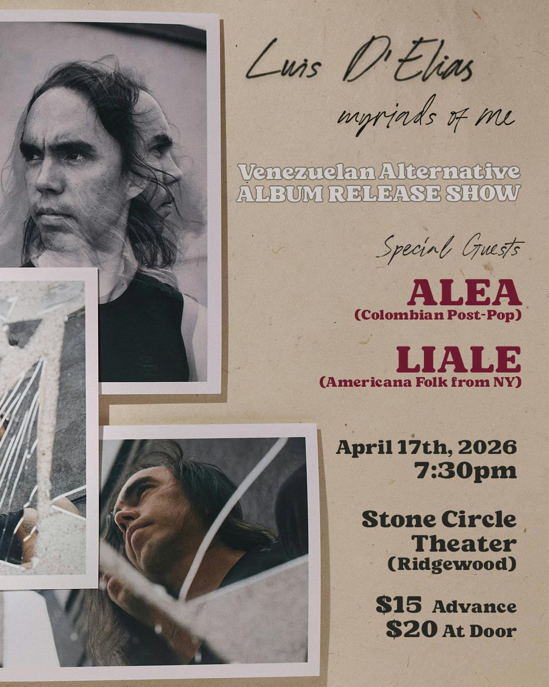 After over a decade composing and producing music for the Venezuelanfusion ensemble New Caracas in NYC, guitarist and composer Luis D'Eliasis stepping into new territory with "Myriads of Me" — his most vulnerableand personal work yet. For the first time, Luis is singing the songs hewrites, weaving together stories that span cultures, genres, and emotionallandscapes.With influences ranging from Peter Gabriel and Devendra Banhart to CaféTacvba and Calexico, Luis's music is a genre-fluid journey throughVenezuelan folk, indie alternative, and introspective art rock. Expectintimate storytelling, intricate guitar work, and moments that move fromcontemplative to explosive — all delivered with the energy and authenticityof someone finally sharing their own voice.Joined by special guests ALEA (Colombian Post-Pop) and LIALE(Americana Folk from NY), this album release show promises to be anevening of connection, discovery, and deeply felt music, showcasing thewide breadth of Latin Music in an intimate context.