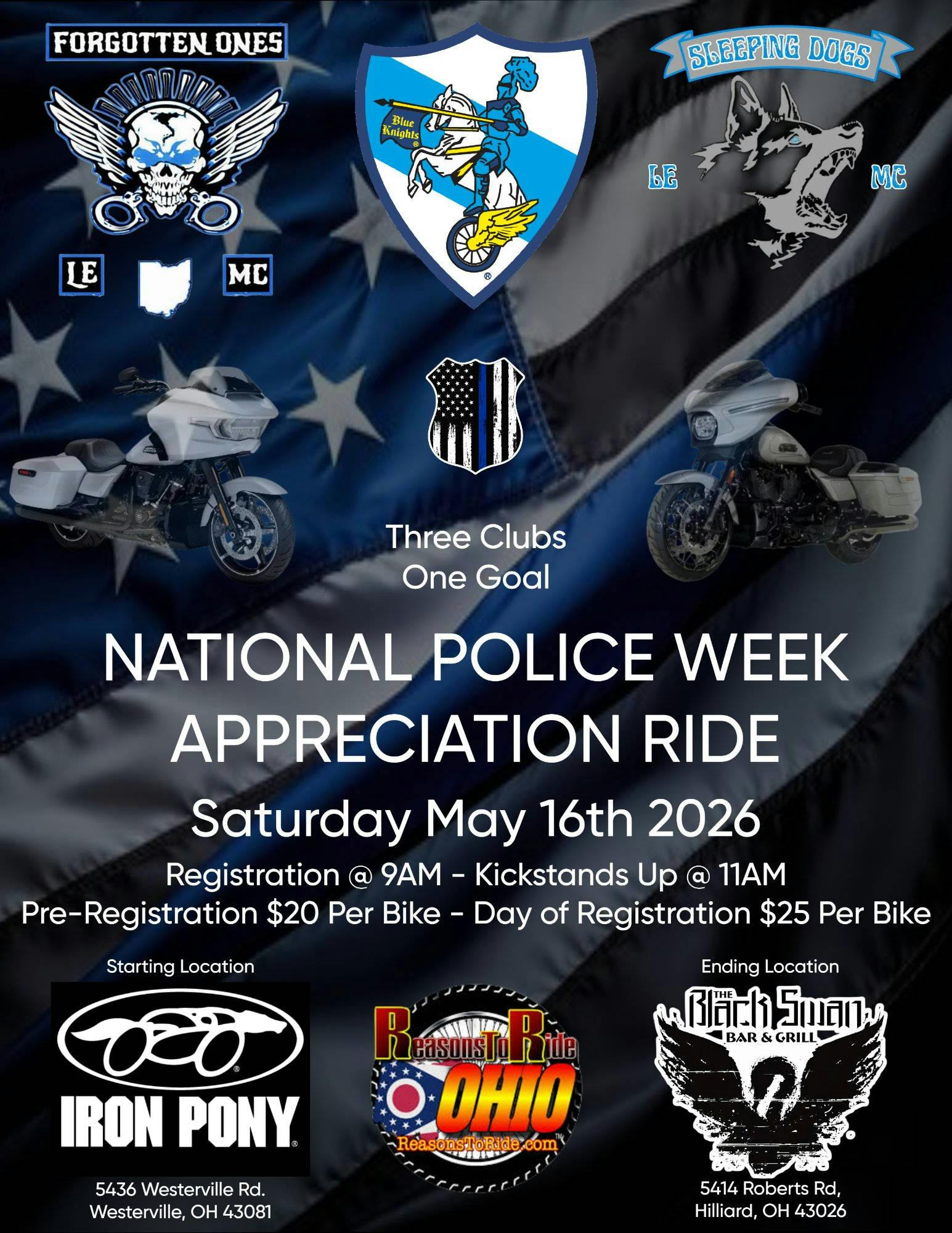 This event is proudly presented by Forgotten Ones LEMC, Blue Knights LEMC, and Sleeping Dogs LEMC, in partnership with Reasons to Ride, Iron Pony Motorsports, and Black Swan Bar & Grill.