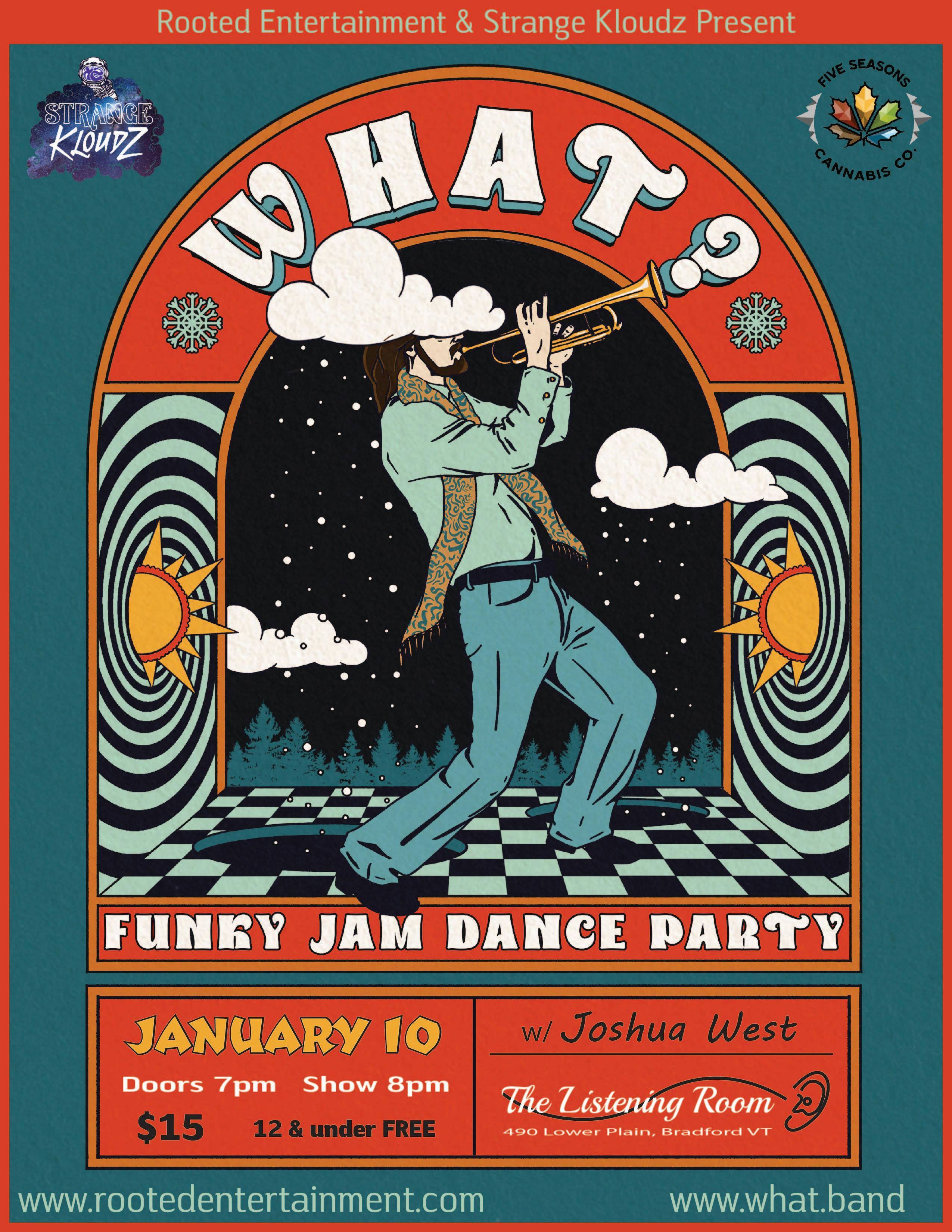 On Friday January 10th, join Rooted Entertainment and Strange Kloudz for a FUNKY JAM DANCE PARTY at The Listening Room with the band What? and special guest Joshua West!!